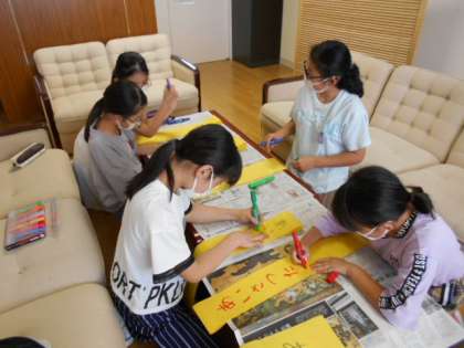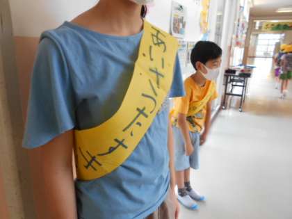 そのたすきに、「あいさつたすきリレー」と、6年生に書いてもらいました。ちょっと工夫して、色を重ねて囲んだりかわいいイラストを付けたりしてくれました。