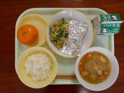 9月3日(金)の給食は、「ご飯、牛乳、鯖の銀紙焼き、ハリハリ和え、冬瓜の吉野煮、冷凍みかん」でした。