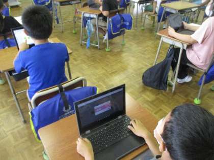 国語科で、グループに分かれて「山小屋で三日間すごすなら」何をもっていきたいかを考えています。一人一台端末のおかげで、密にならずとも友達の意見が分かります。これから、グループで持ち物を5つに絞ります。「自分の意見をしっかり伝える力」「相手の考えを理解し受け止める心」を大切に学習を進めたいと思います。