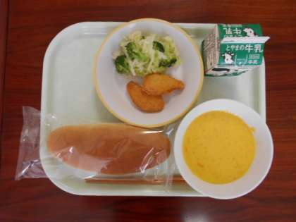 9月7日(火)の給食は、「コッペパン、牛乳、チキンナゲット、フレンチサラダ、かぼちゃポタージュ」でした。