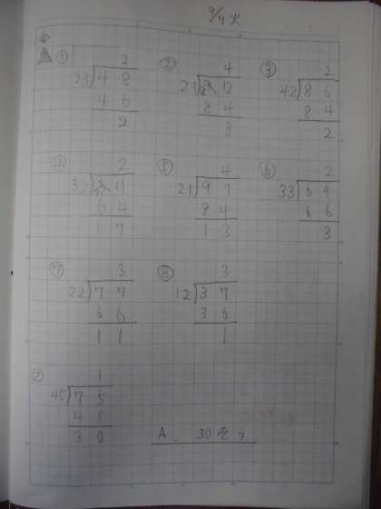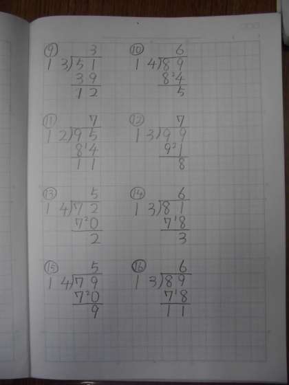 2桁÷2桁の学習は、難しいところで、何度も練習する必要があります。自主学習で、算数のわり算の筆算の復習をしてきている子供が多くいました。