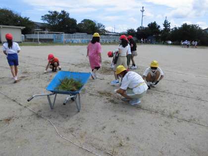 グラウンドの草をきれいにし、使いやすくしようと、環境委員会が「草むしりフェスティバル」を企画しました。