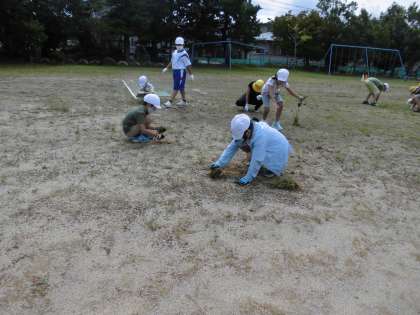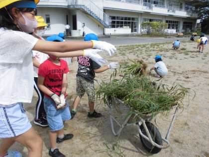 全校のみんなでグラウンドの草を一生懸命むしり、きれいにしようとがんばりました。