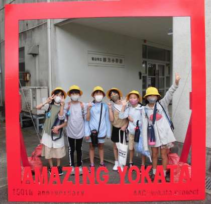 四方小学校の玄関前に、「AMAZING YOKATA」の赤色のモニュメントが設置されました。