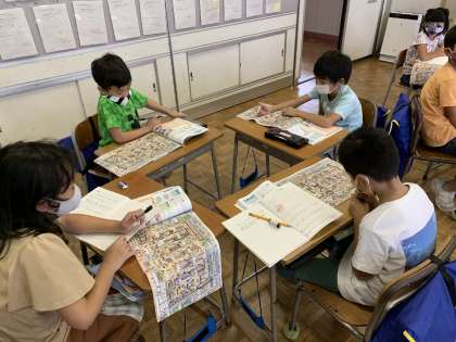 教科書の挿絵をもとに、スーパーマーケットのひみつを探しました。まず自分で探し、次にグループのみんなで教え合い、最後に全体で見つけた「ひみつ」を共有しました。子供たちは、たくさん見つけることができて大満足のようです。あっという間に時間が過ぎてしまいました。