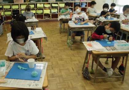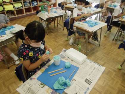 粘土でパフェやドーナツ、お寿司など、ごちそうを作りました。「ほんとうに食べられたらいいのになあ」という声が聞こえてきました。
