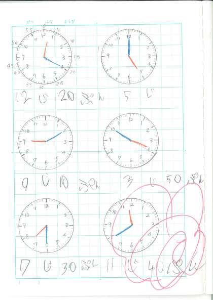 左側のノートは、時計の読み方の練習です。家庭の協力をいただきながら、学習を進めています。
