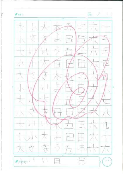 右側のノートは、習ったばかりの漢字練習です。止め・はね・はらいの基本がしっかりと身に付いていて、すばらしいです。