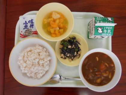 10月8日(金)の給食は、「麦ご飯、牛乳、食べキリンハヤシ、大豆とひじきのサラダ、フルーツゼリーミックス、味付け小魚」でした。