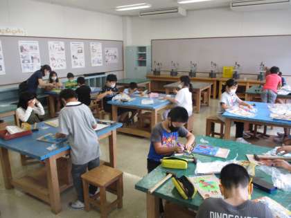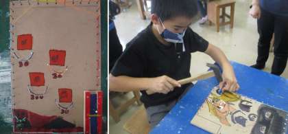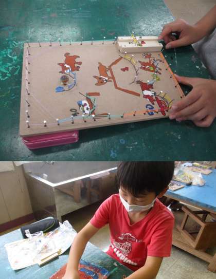 図画工作科の時間に、金槌を使って作品を作っています。完成すると、遊べるゲームとなっているので、みんなワクワクが止まりません。一心不乱にトントンしていました。