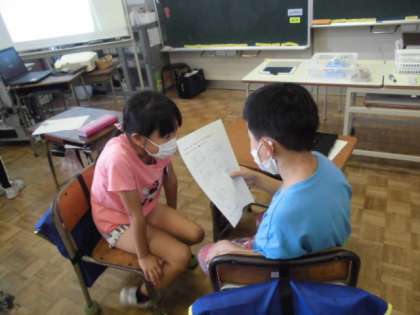1枚目は学級活動の時間に「自分のすきなこと、興味のあること、がんばっていること」を考えてペアで交流しているところです。自分のことを知ってもらおう、友達のことをもっと知ろうとしている子供たちです。