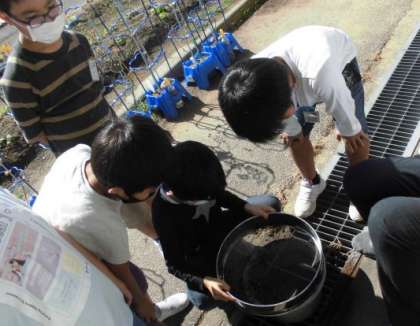 3枚目は、カブトムシの土かえをしているところです。カブトムシの幼虫が2年教室に仲間入りしました。3年生の岡野先生に教えてもらって土をかえてあげました。大事にお世話しています。