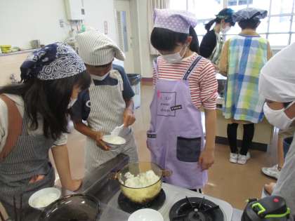 家庭科の調理実習で、炊飯をしました。米を洗う、加熱している鍋(透明)の中の様子を見る、できたご飯をよそう等 一つ一つの過程に興味津々でした。給食後の調理実習でしたが、一人半合を食べ切りました。そのくらい おいしく炊けて嬉しかったのだと思います。