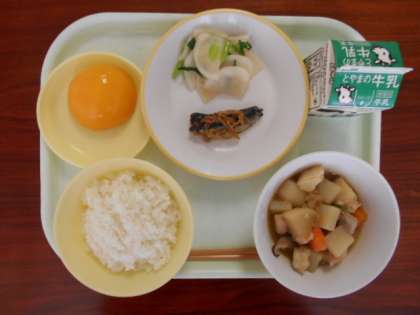 10月18日(月)の給食は、「ご飯、牛乳、大根と鳥肉のうま煮、鰯のショウガ味、カブの彩り、ももかん」でした。