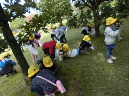 職員の方に案内していただき、散策をしながら木の実をたくさん集めました。どんぐりによって形や大きさがちがうことに気付いている子供もいました。木の実を持ち帰りましたので、見つけた秋の話を聞いてあげてください。
