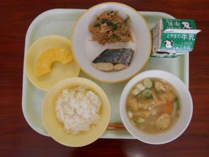 11月8日(月)の給食は、「ご飯、牛乳、サワラの塩焼き、しらたきのビリ辛炒め、白玉汁、カットパイン」でした。