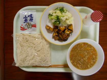 今日は、久しぶりのソフト麺でした。肉みそが麺に絡んでとてもおいしかったです。花野菜サラダはドレッシングの味がさっぱりとしています。大学いもは甘さがよかったです。交互に食べても、終わりの方に食べてもおいしいですね。