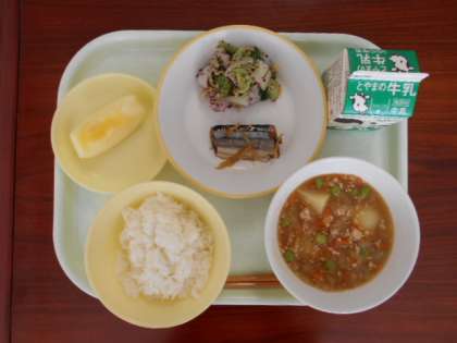 12月3日(金)の給食は、「ご飯、牛乳、じゃがいものそぼろあん、サンマのショウガ味、ゆかり和え、りんご」でした。