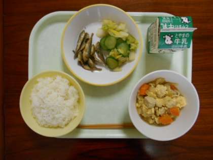 12月6日(月)の給食は、「ご飯、牛乳、親子煮、小アジのからあげ、白菜ひたし」でした。