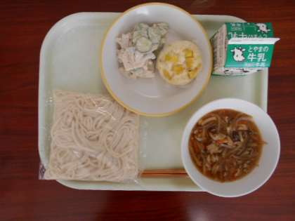 12月9日(木)の給食は、「ソフト麺、牛乳、五目あんかけ、蒸しパン、レンコンサラダ」でした。