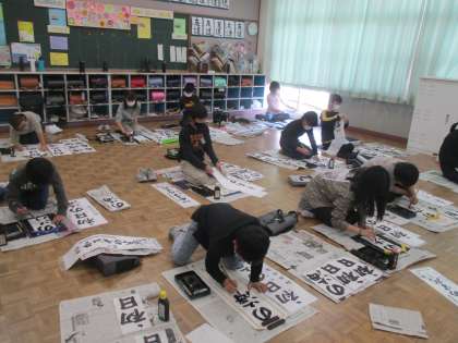 「心を落ち着かせて書く」「ひらがなと漢字の大きさに気をつける」など目当てをもち、書き初めの練習に取り組みました。