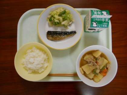 2月4日(金)の給食は、「ご飯、牛乳、いわしの土佐煮、野菜ソテー、豚肉とじゃがいものうま煮」でした。