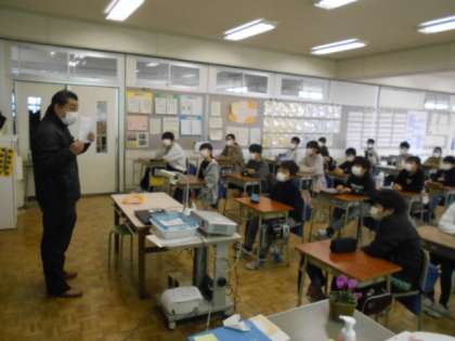 卒業記念のかまぼこ作りについて、事前のレクチャーを受けました。四方かまぼこの方から実物を見せてもらい、絞り出しの特性を聞きました。このあと各自のデザインを考えていきます。