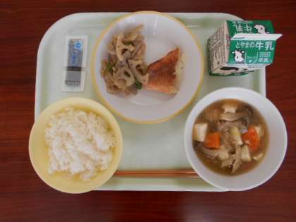 3月2日(水)の給食は、「ご飯、牛乳、赤魚の塩焼き、れんこんのきんぴら、豆腐と野菜のうま煮、のりつくだに」でした。