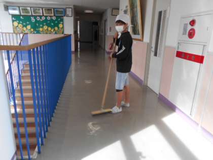 上:長い廊下は高学年担当です。一人でもしっかりと清掃しています。真面目に取り組んでいます。