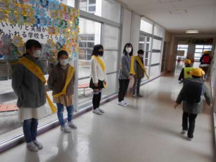3月8日(火)あいさつたすきリレー第25走者スタートしました。今回も3日間です。短い日数ですが、気持ちのよい挨拶をしようと頑張っている4・5年生のメンバーです。