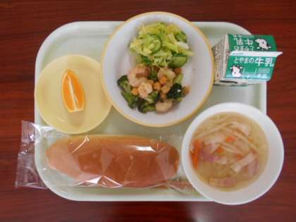 3月8日(火)の給食は、「米粉コッペパン、牛乳、えびとひよこ豆のオリーブオイル炒め、添え野菜、ポテトスープ、清美オレンジ」でした。