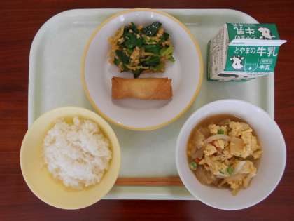 3月9日(水)の給食は、「ご飯、牛乳、親子煮、春巻き、納豆和え」でした。
