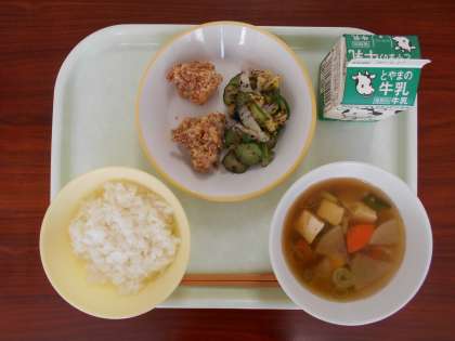 3月10日(木)の給食は、「ご飯、牛乳、鶏肉の竜田揚げ、ゆかり和え、けんちん汁」でした。