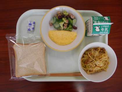3月15日(火)の給食は、「食パン(減)、牛乳、焼きそば、オムレツ、ビーンズサラダ、ポケットチーズ」でした。