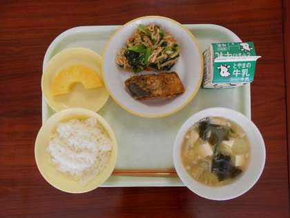 3月16日(水)の給食は、「ご飯、牛乳、魚の蒲焼き、はりはり和え、味噌汁、カットパイン」でした。