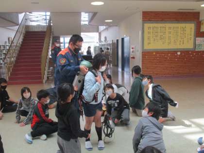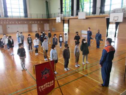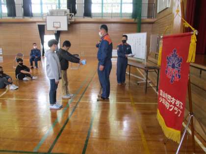富山北消防署和合出張所より所員の方に来校いただき、BFCバッジ授与式を行ないました。クラブ員として、防火防災に関する呼びかけや知識を広める任務を受け、これからがんばっていこうと意識を高めました。