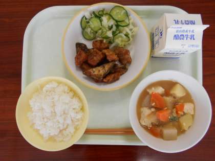 5月12日(木)の給食は、「ご飯、牛乳、豚肉とレバーの揚げからめ、きざみ和え、ごまけんちん」でした。