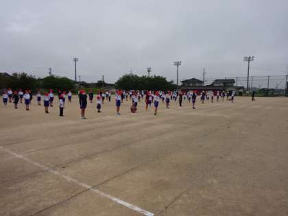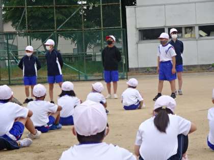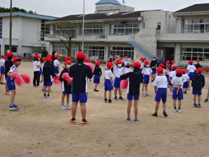 3時間目に全校で応援練習をしました。赤と白の両団ともきれいに並んで練習を進めていました。