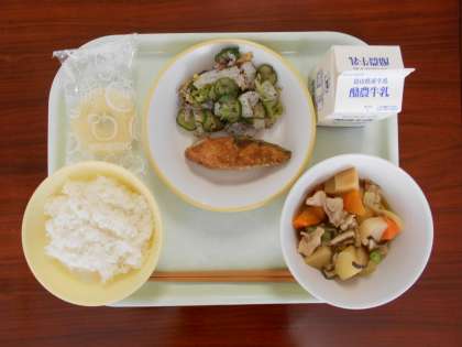 5月16日(月)の給食は、「ご飯、牛乳、魚の米粉揚げ、ゆかり和え、筑前炊き、冷凍パイン」でした。