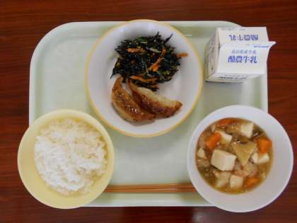 5月18日(水)の給食は、「ご飯、牛乳、えびと豆腐のうま煮、焼き餃子、ひじきのごま和え」でした。