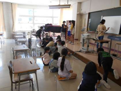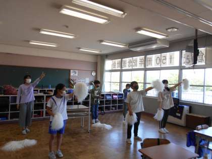 白団は、教室で振り付けの特訓中でした。応援歌の時、もっと音楽に乗って膝をつかったり手拍子を大きくしたりしようと、自分たちで声を掛け合いながら行っていていいねでした。