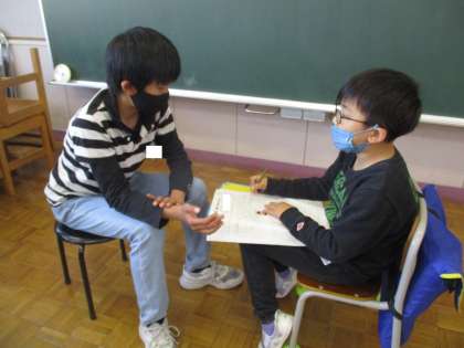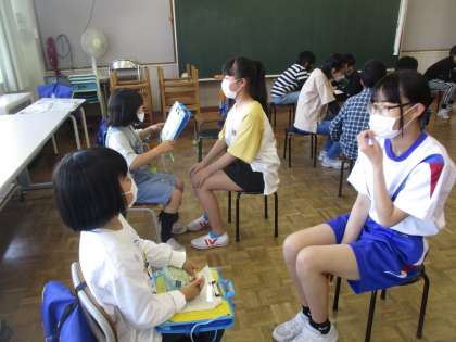 今日は、掃除や運動会練習で関わっている6年生の「すてき」を見付けるためのインタビューを行いました。「すてき」を引き出せるような質問をその場で考え、次々と会話をしていました。活動の後には、「6年生がやさしく答えてくれたよ」「たくさん話をしてくれてうれしかったよ」と話していました。