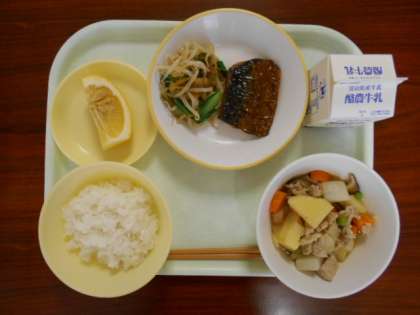 6月3日(金)の給食は、「ご飯、牛乳、鯖の塩焼き、香味和え、豚肉の南蛮煮、河内晩柑」でした。