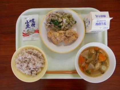 6月6日(月)の給食は、「雑穀入りご飯、牛乳、鶏肉の唐揚げ、ゆかり和え、すいとん、味付け小魚」でした。