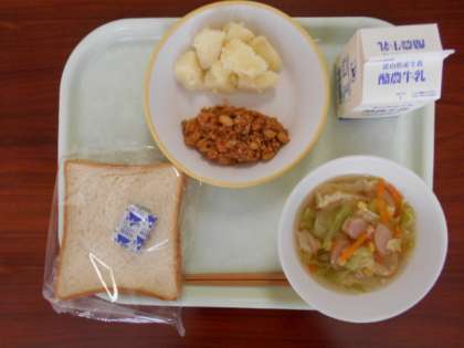 6月7日(火)の給食は、「食パン、牛乳、チリコンカン、粉ふきいも、キャベツスープ、ポケットチーズ」でした。