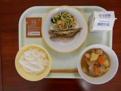 6月16日(木)の給食は、「ご飯、牛乳、ししゃもの唐揚げ、はりはり和え、鶏肉とじゃがいもの胡麻煮、大豆ふりかけ」でした。