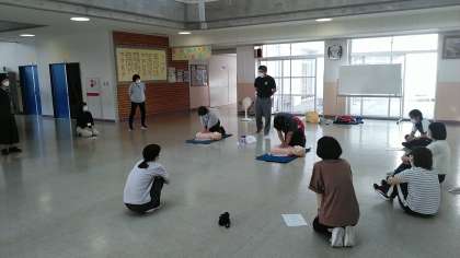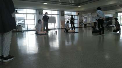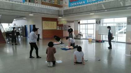 消防署の方に来ていただいて、心肺蘇生法の訓練を行いました。保護者の方の参加もあり、プール開放に向けて準備万端です。