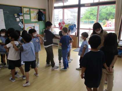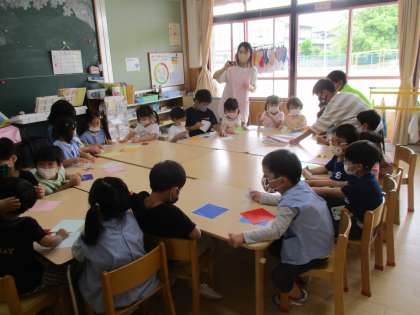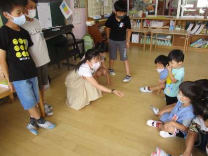 総合の学習で、四方こども園の園児たちと交流してきました。「じゃんけん列車」や「折り紙」「だるまさんが転んだ」などの遊びを計画・準備していった子供たち。学校へ戻って、「楽しんでくれた」「少しルールが難しかったかも」などと感想を話していました。