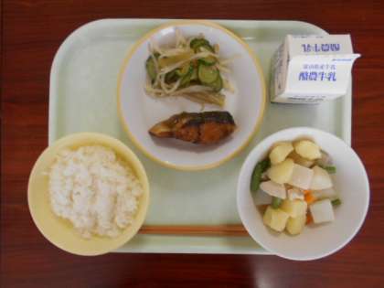 6月20日(月)の給食は、「ご飯、牛乳、魚の梅風味蒲焼き、茎わかめの中華和え、じゃがいもの味噌煮込み」でした。