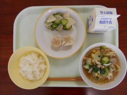 6月23日(木)の給食は、「ご飯、牛乳、かにシューマイ、大根サラダ、札幌ラーメン、野菜ふりかけ」でした。